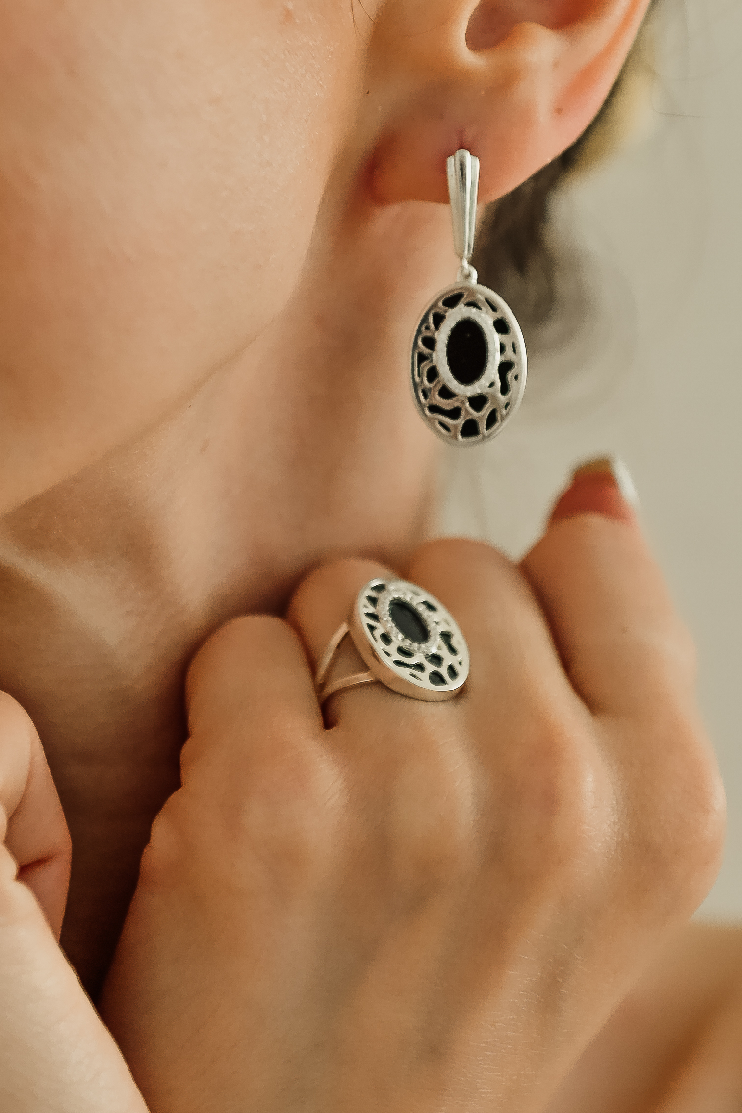 Ефектна каблучка овальної форми, яка візуально видовжить ваші пальчики. Сміливе поєднання білого срібла та чорного оніксу неодмінно буде притягувати захоплені погляди оточуючих.