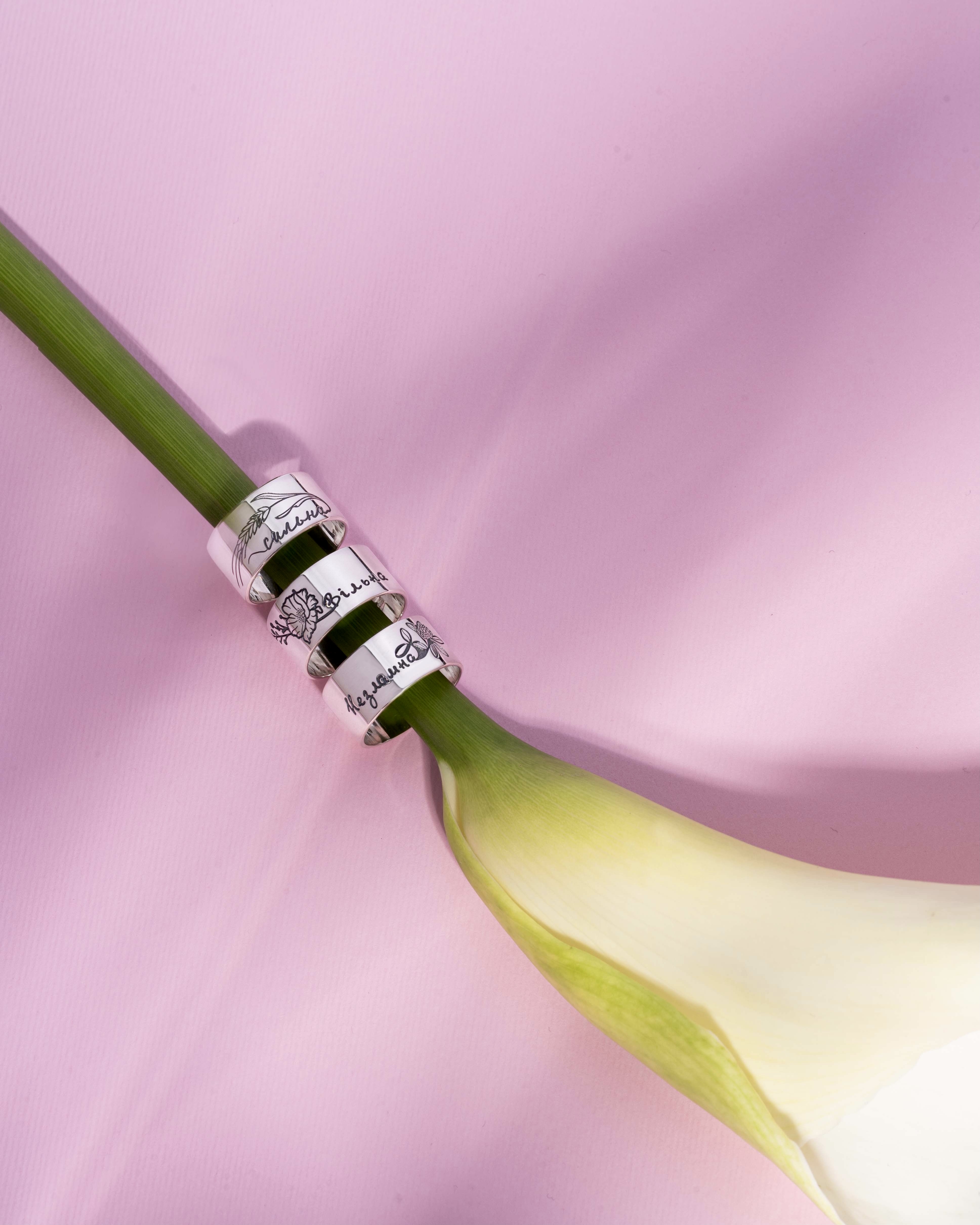 Акцентна каблучка з українською харизмою з написами “СИЛЬНА”, “ВІЛЬНА”, “НЕЗЛАМНА”.