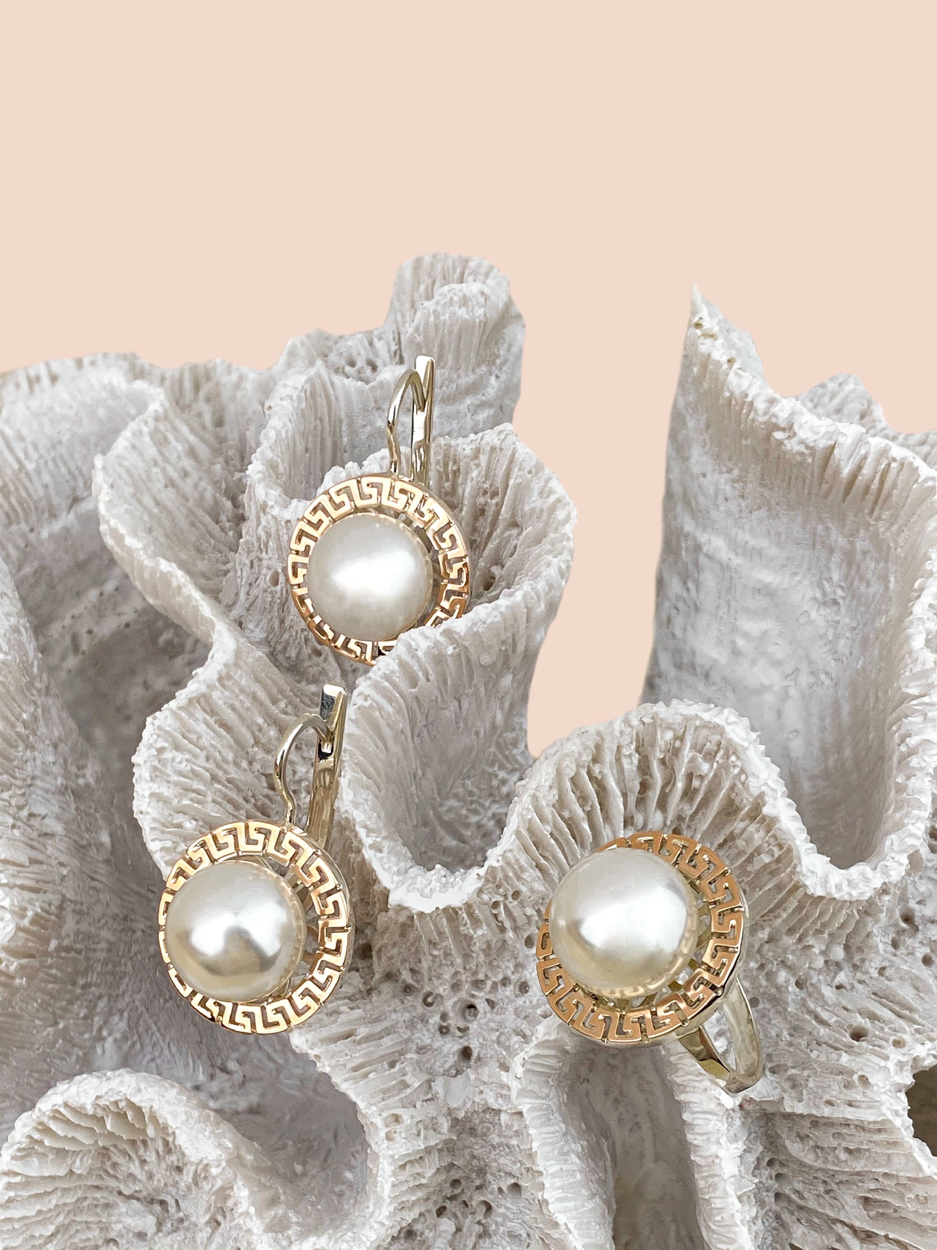 Розкішні прикраси зі срібла 925 проби та золотого елемента у вигляді грецького орнаменту. Доповнені ідеальною перлиною круглої форми. В цих прикрасах ви відчуєте себе щонайменше королевою!