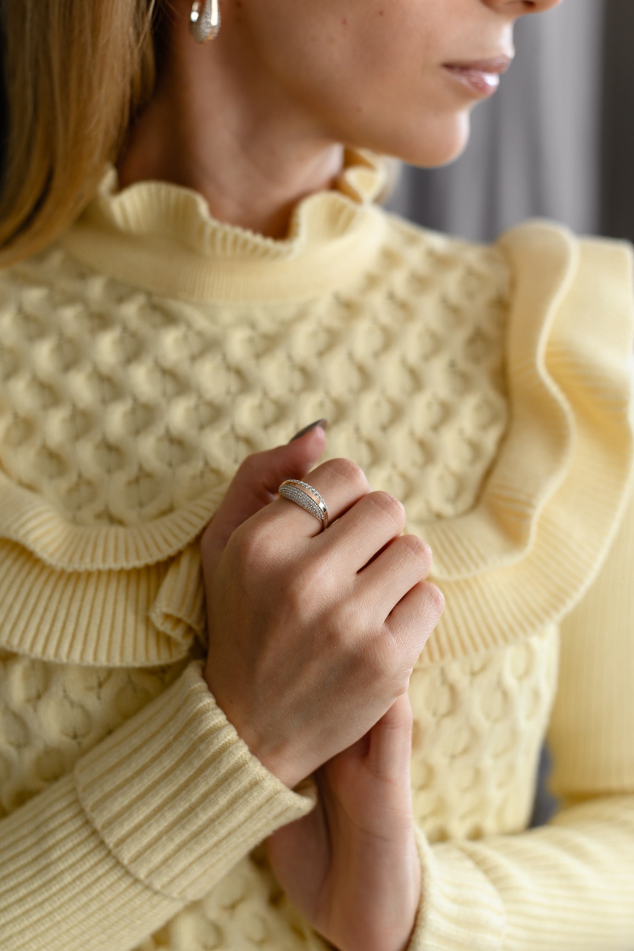 Чарівна срібна каблучка з ефектним золотим елементом. Завдякі сяючим фіанітам справляє незабутнє враження.