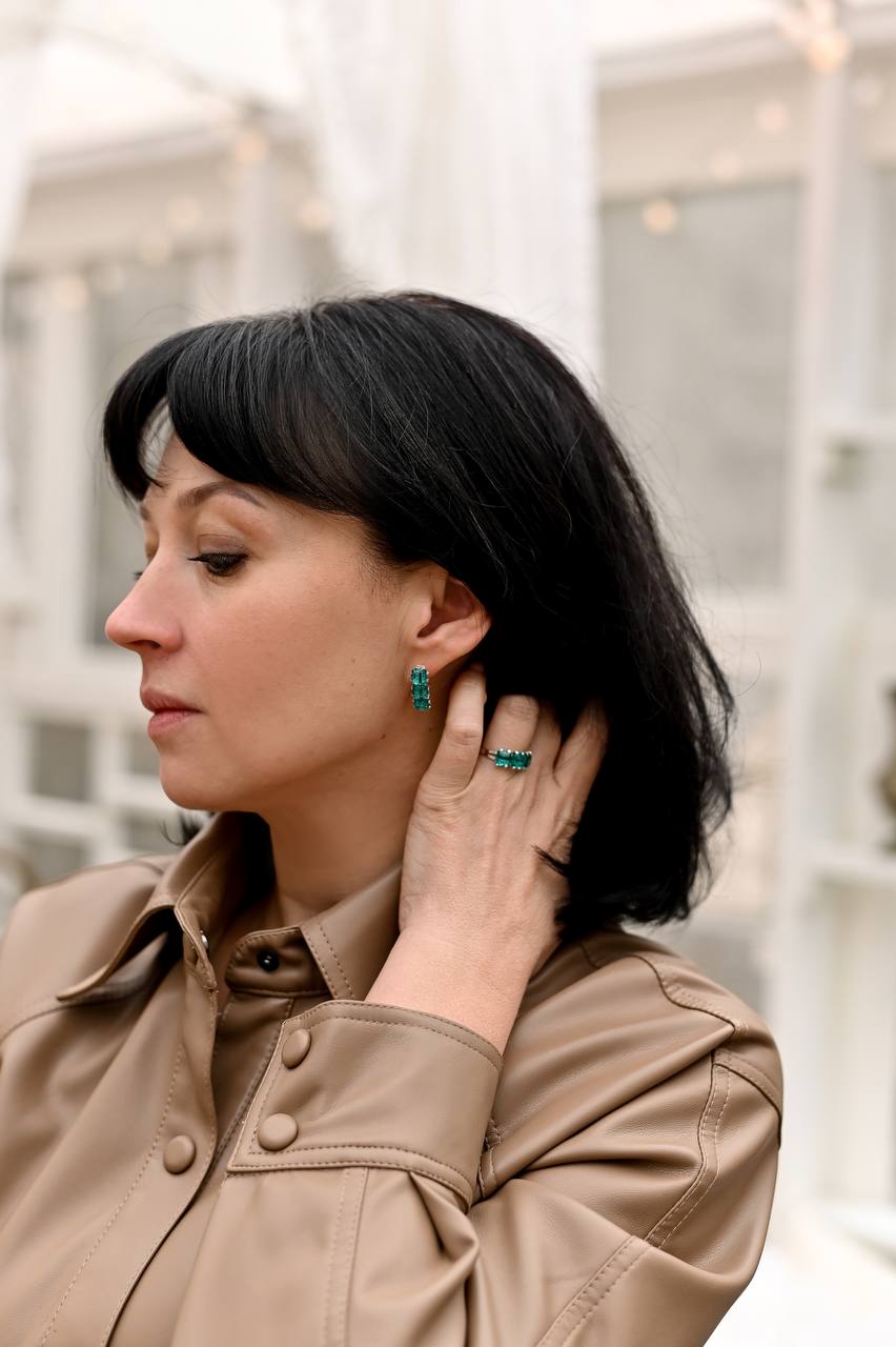 Сережки цього сету мають англійську застибку – мега зручну і надійну. Крючок приспущений, що дозволяє прикрити дірочку прокола. Таким чином сережка дуже охайно виглядає на вусі.