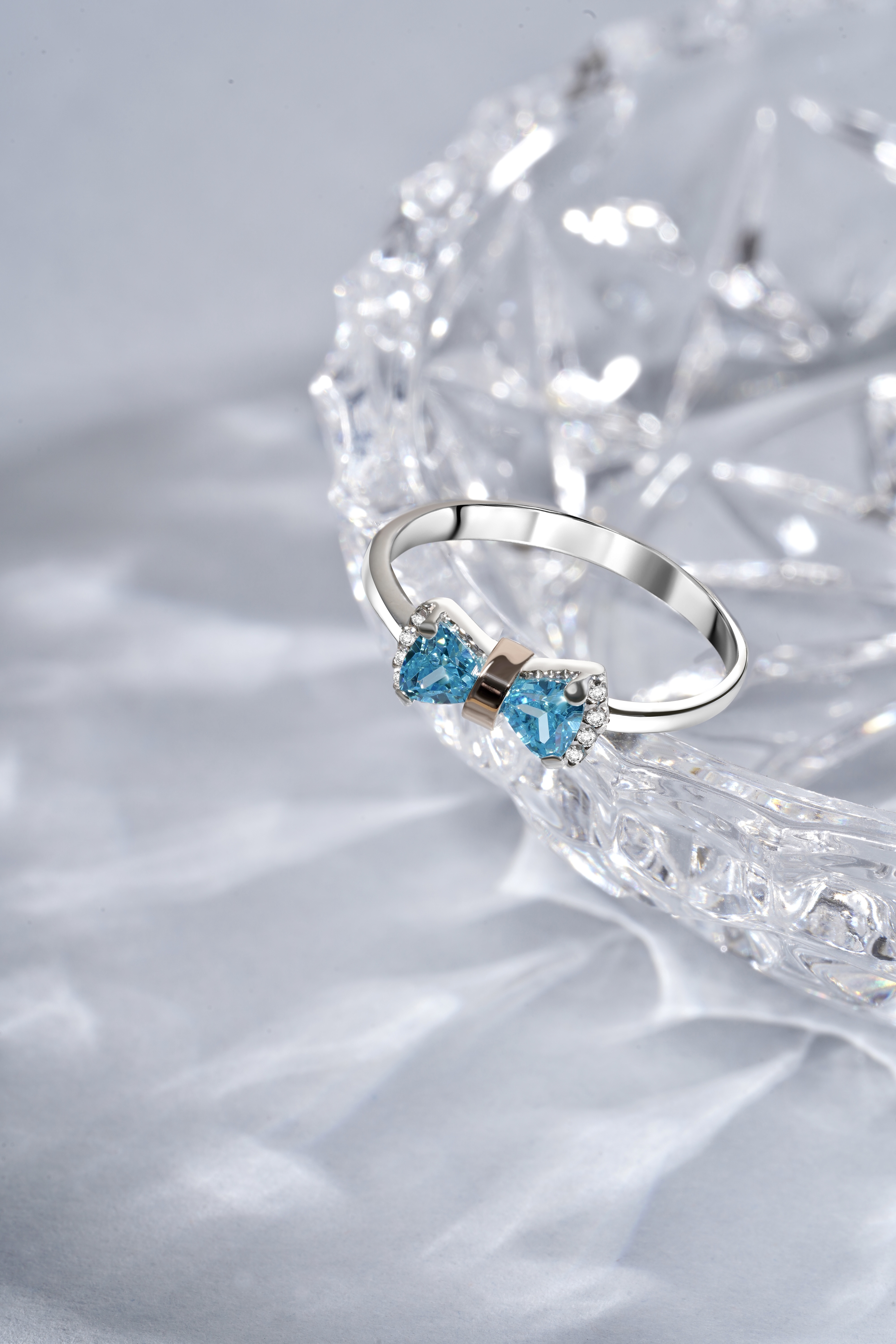 Ніжна каблучка у вигляді банту з золотим елементом і кольоровими фіанітами (блакитними, бузковими, рожевими, зеленими).